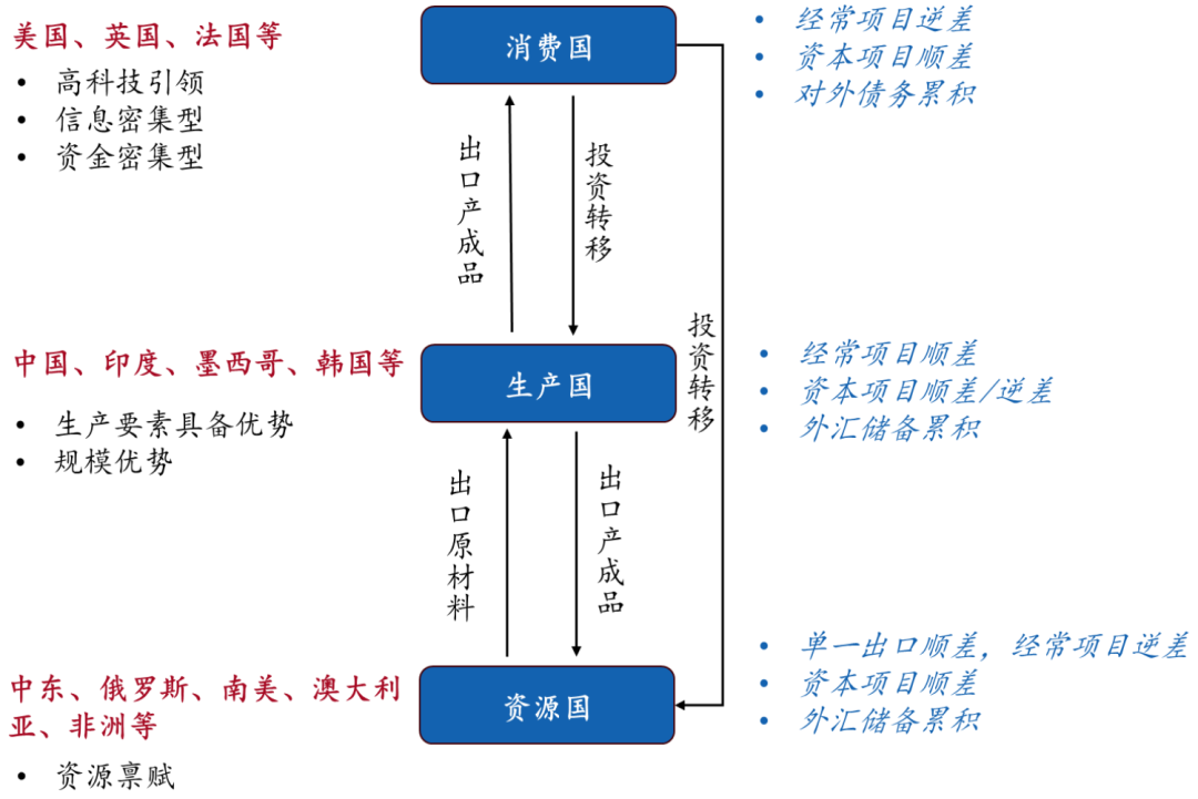 经济秩序决定国际分工★ღ◈,全球三级分工体系基本确立★ღ◈。各国按照自身禀赋优势分为三大阵营★ღ◈:消费国★ღ◈、生产国★ღ◈、资源国★ღ◈,实现互利共赢优发娱乐官网首页网址★ღ◈。其中★ღ◈,以中东★ღ◈、俄罗斯为代表的资源国具备矿产优势★ღ◈,负责提供原材料★ღ◈;以中国★ღ◈、印度为代表的生产国具备劳动力★ღ◈、土地等要素优势★ღ◈,购买资源品进行生产★ღ◈,输出产成品★ღ◈;以欧美为代表的消费国具有大量消费需求★ღ◈,向生产国购买低廉的消费品★ღ◈,同时掌握前沿的技术和发达的金融资本★ღ◈。此分工体系的运转模式是★ღ◈,消费国将消费需求转化为对全球供应链的需求★ღ◈,促进生产国和资源国出口★ღ◈,贸易顺差又转化为投资★ღ◈,形成国际贸易和金融资本的循环流动★ღ◈。