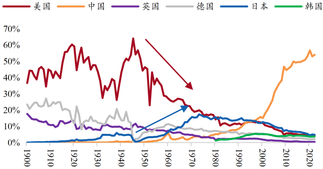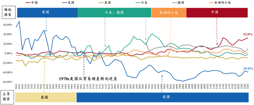 1950s和1970s★ღ◈,美国主导推动两轮产业转移★ღ◈,跨国公司迅速发展★ღ◈。二战后美国制造业迎来黄金时代★ღ◈,利用战争积累的技术和资金优势发展钢铁★ღ◈、汽车★ღ◈、机械★ღ◈、化工★ღ◈、电气等资本密集型产业★ღ◈。为实现资源的集中高效利用★ღ◈,通过马歇尔计划等援助项目★ღ◈,美国主动推动钢铁★ღ◈、纺织等劳动密集型产业向日本和德国转移★ღ◈。在1970s信息技术革命的带动下★ღ◈,美国推动制造业环节向亚洲四小龙转移★ღ◈,以进一步完成产业结构向“高端制造业+现代服务业”转型★ღ◈。1965-1971年★ღ◈,美国的对外直接投资年均增长达12%★ღ◈,通过6000余家美资跨国公司将产能输出至海外★ღ◈。1970s★ღ◈,美国从贸易顺差国转为逆差国★ღ◈,工业占比已降至30%左右★ღ◈。自此★ღ◈,美国长期维持高额贸易赤字★ღ◈,而贸易盈余国不断更迭★ღ◈,全球贸易格局可以用铁打的“最终消费者”和流水的“世界工厂”来概括★ღ◈。