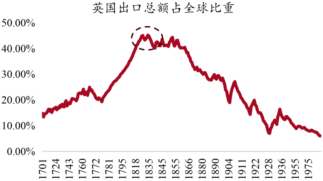 伴随经济增长★ღ◈,英国成为“世界工厂”★ღ◈。19世纪中叶★ღ◈,凭借生产力突破★ღ◈,英国在全球GDP中所占份额达到近20%★ღ◈,超过荷兰成为世界第一超级大国★ღ◈。与此同时★ღ◈,英国工业品倾销全球★ღ◈,在全球出口中所占份额于1850年触及40%左右的顶峰★ღ◈,确立了“世界工厂”地位 ★ღ◈。英国的主要出口品类包括棉纺织品★ღ◈、铁路设备★ღ◈、煤炭★ღ◈、金属等★ღ◈,其中棉产品占英国出口总值的40%-50%★ღ◈。