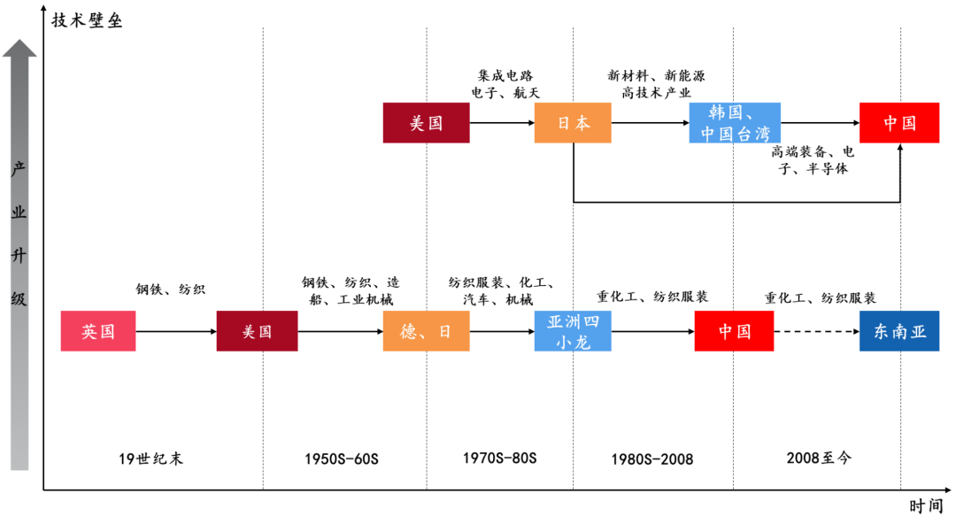 英国★ღ◈、美国★ღ◈、日本的产业出海经验表明★ღ◈,产业转移浪潮有助于推动产业结构升级★ღ◈。依托国际分工的不断深入与生产环节的合理配置★ღ◈,跨国企业在全球范围内开展专业化分工★ღ◈,国际产业迁移浪潮得以不断发展★ღ◈。产业转移的核心逻辑是★ღ◈,承接国依靠要素成本优势承接发达经济体向外转移的低附加值环节★ღ◈,转出国则腾出资源专注于高附加值产业★ღ◈。产业转移初期★ღ◈,承接国主要承接纺织★ღ◈、钢铁★ღ◈、煤炭等劳动密集型行业★ღ◈;后逐步延伸至机电★ღ◈、造船★ღ◈、化工等资本密集型产业★ღ◈,在此过程中承接国本土的工业化程度不断提升★ღ◈。产业迁出国则沿着“劳动密集型轻工业-资本密集型重工业-技术密集型新兴产业”的路径转型升级★ღ◈。2008年后★ღ◈,我国部分劳动密集型产业(纺服★ღ◈、家电等)陆续向东南亚转移★ღ◈,为国内产业升级创造了必要条件★ღ◈。