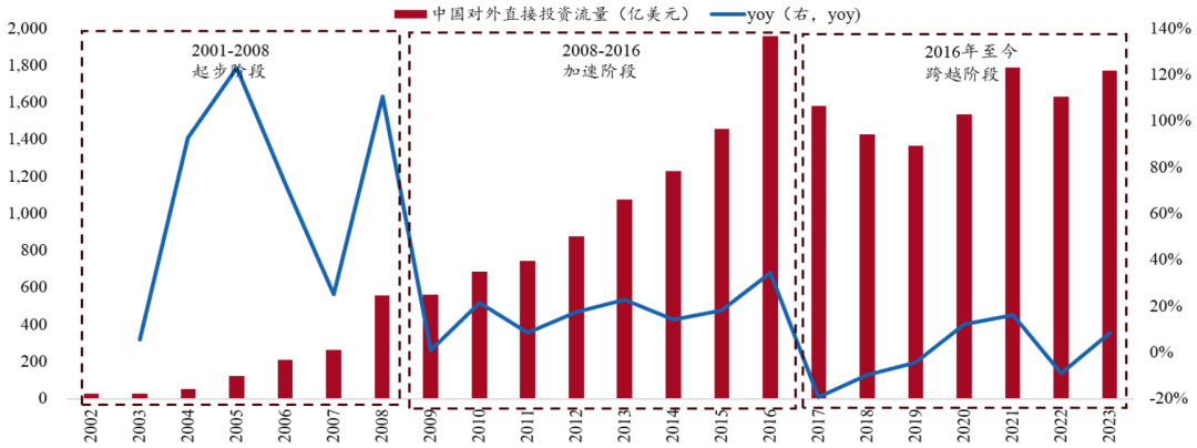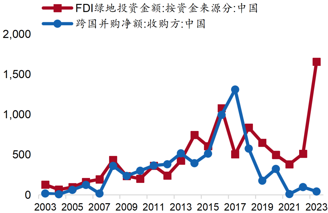在出口结构转型升级的同时★ღ◈,中国企业开展对外投资的步伐加速★ღ◈。对外直接投资可产生逆向技术溢出效应★ღ◈,中企通过收购兼并等方式走出国门★ღ◈,与东道国企业开展研发合作★ღ◈,获取前沿技术和渠道资源★ღ◈,进一步打开国际市场★ღ◈,促进商品出口多元化和高端化★ღ◈。代表性案例包括海尔收购GEA★ღ◈、吉利收购沃尔沃★ღ◈、联想收购IBM PC等★ღ◈。2013年“一带一路”倡议的提出★ღ◈,标志着我国从参与全球化转向塑造全球化★ღ◈,亚太和中东欧地区的出海空间被打开★ღ◈。此后中企对外直接投资步入加速阶段★ღ◈, 2015年我国ODI实现历史性突破★ღ◈,晋升为全球第二★ღ◈。
