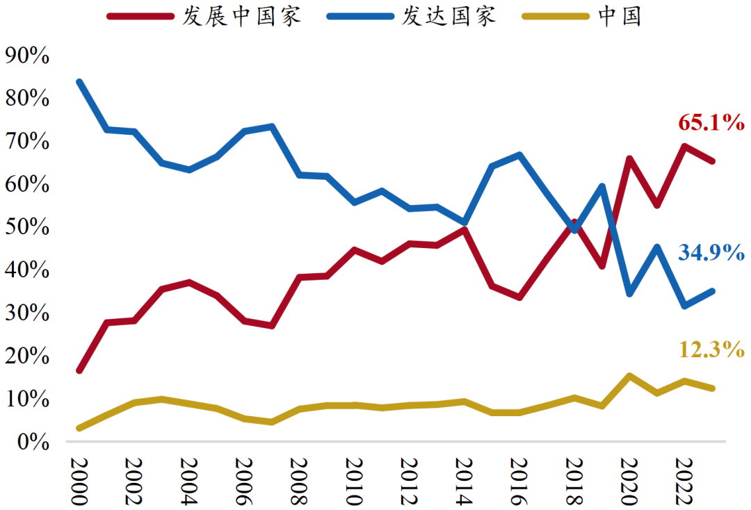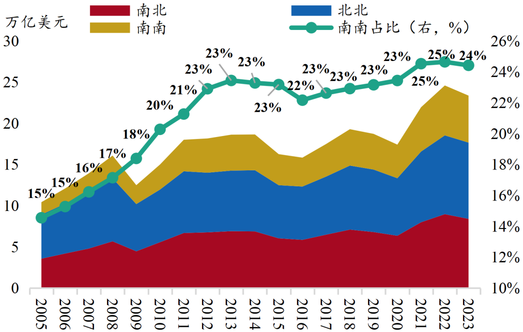 在全球贸易增速放缓的大背景下★ღ◈,南南贸易实现强劲增长★ღ◈。2008年次贷危机后★ღ◈,贸易保护主义兴起★ღ◈,“逆全球化”趋势加剧★ღ◈,代表贸易自由度的全球贸易额占GDP比重呈现出增长停滞态势★ღ◈,这一趋势延续至今★ღ◈。与上一轮全球化黄金时期(1980-2008年)相比★ღ◈,2008-2023年全球进出口额的增长中枢从8%回落至2.5%★ღ◈。然而★ღ◈,全球贸易增速放缓的同时★ღ◈,新兴经济体相继崛起★ღ◈,2008-2023年南南贸易(即发展中国家间的贸易★ღ◈,流量口径)从2.8万亿美元增长至5.7万亿美元★ღ◈,实现翻番★ღ◈,占全球贸易的比重从17%抬升至24%★ღ◈,表明发展中国家逐步减少对传统贸易伙伴的依赖★ღ◈,并加强区域经济一体化★ღ◈。南南合作的增强同样催生出新的资本流动模式★ღ◈,2023年全球南方已拥有65%以上的外商直接投资额★ღ◈。伴随我国“走出去”进程加快★ღ◈,中国在南南合作中扮演重要角色★ღ◈,“全球南方”国家在我国贸易总额中的占比超过50%★ღ◈。