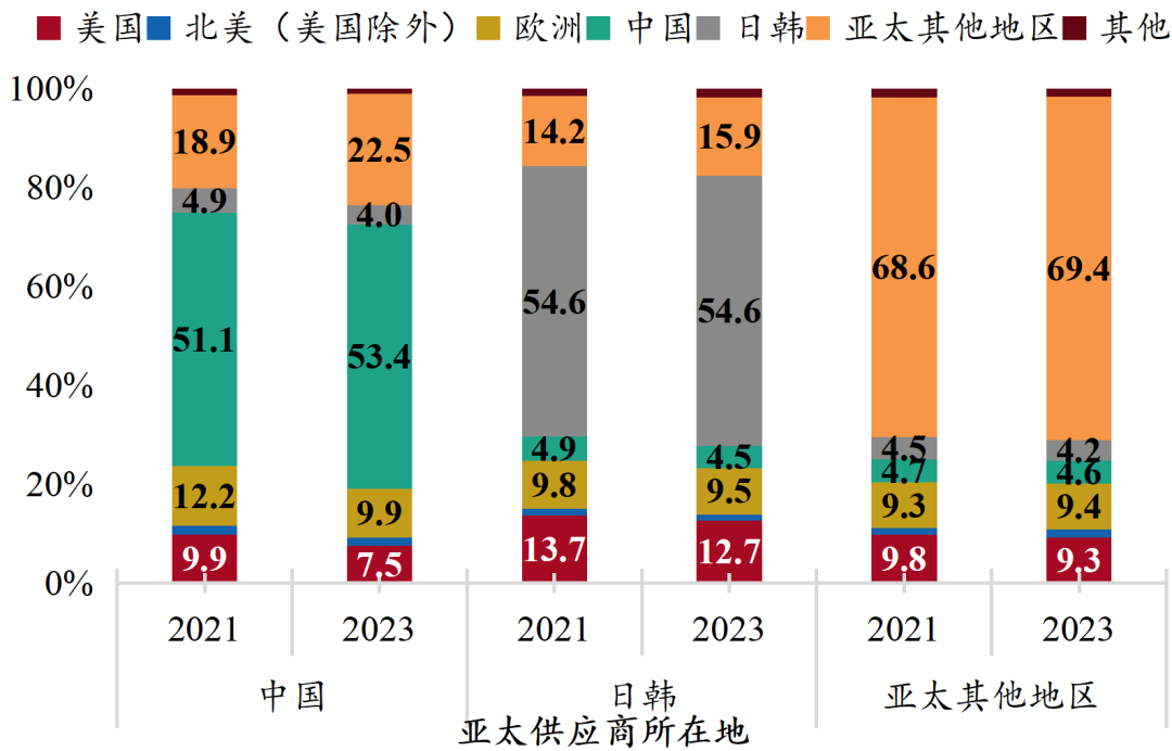 亚太区域内部的产业联系愈发紧密★ღ◈,区域经贸一体化程度加深★ღ◈。按购买力平价计算★ღ◈,2024年亚洲经济体GDP总量占世界比重已达48.1%★ღ◈。2023年★ღ◈,亚洲在全球中间品贸易的占比为41.2%★ღ◈,远超欧盟的25.5%和北美的15.1%★ღ◈。据BIS调查数据★ღ◈,2021-2023年★ღ◈,从中国供应商的客户分布看★ღ◈,来自亚太地区的客户占比从74.9%抬升至79.8%★ღ◈,主要增量来自中日韩之外的亚太其他地区★ღ◈;从亚太地区客户的供应商分布看★ღ◈,来自美欧的供应商有不同程度份额下降★ღ◈,来自亚太本土的供应商占比相应提升★ღ◈。
