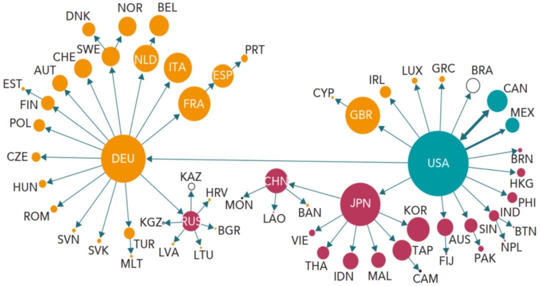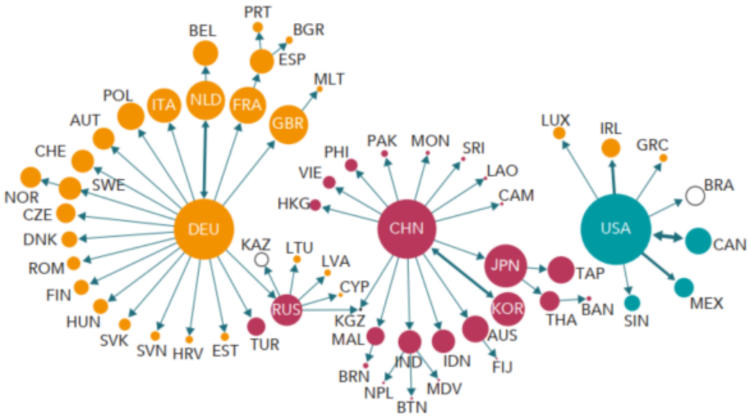中国在亚太地区发挥引擎作用★ღ◈,是亚洲贸易网络的中心国★ღ◈。据亚洲开发银行★ღ◈,中国对亚太地区的经济增长贡献率超60%★ღ◈,贡献了37.6%的货物贸易增长和44.6%的服务贸易增长★ღ◈。从全球贸易网络看★ღ◈,过去二十年间发生两个明显变化(图31 VS 图32)★ღ◈:一是中国取代日本成为亚洲的制造中心★ღ◈,与亚洲各国(包括新兴经济体在内)产生了紧密的贸易联系★ღ◈。二是全球产业链从一体化转向区域化★ღ◈,区域伙伴间的贸易更为集中★ღ◈,而中★ღ◈、美★ღ◈、德三大区域中心之间的直接联系减少★ღ◈。【注释4】