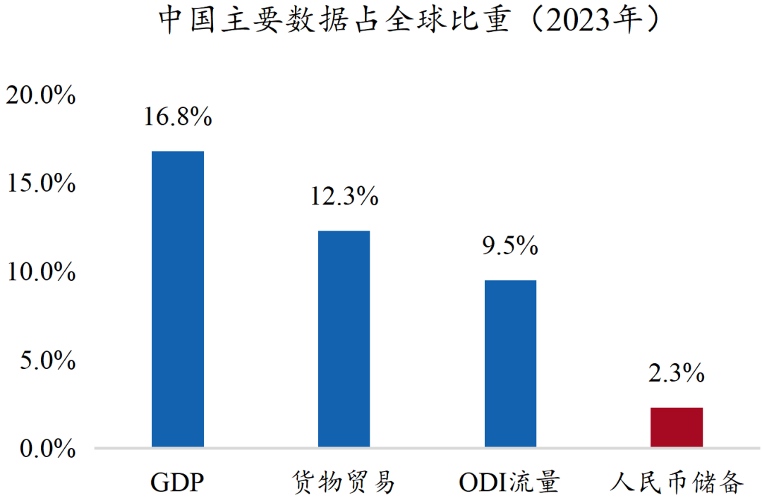 中国经济稳步崛起是推进人民币国际化的基本面支撑★ღ◈。中国拥有占据全球16.8%的GDP总量★ღ◈、12.3%的进出口贸易份额★ღ◈、9.5%的对外投资流量占比★ღ◈,为人民币国际化奠定了坚实的实体经济基础★ღ◈。然而★ღ◈,人民币的国际储备地位与其经贸和投资体量严重不匹配★ღ◈。近年来★ღ◈,人民币在全球外汇储备中的占比呈回落态势★ღ◈,截至2024年末为2.18%★ღ◈,全球排名第六位★ღ◈,存在明显的提升空间★ღ◈。国家信用是主权信用货币得以流通的根本★ღ◈,动荡的美元霸权在一定程度上为人民币国际化创造了有利的机遇期★ღ◈。